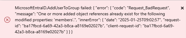 MicrosoftEntraID.AddUserToGroup failed: { "error": { "code": "Request_BadRequest", "message": "One or more added object references already exist for the following modified properties: 'members'.", "innerError": { "date": "2025-01-25T09:02:57", "request-id": "ba17fbcd-6a69-42a3-b8ca-a8169e02027b", "client-request-id": "ba17fbcd-6a69-42a3-b8ca-a8169e02027b" } }}