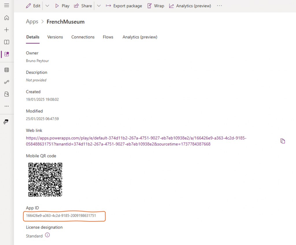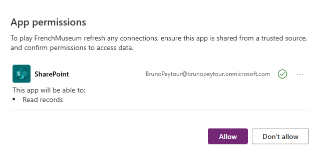 When a user connects to PowerApps, a window is displayed authorising rights to the connectors used in the application. For example, if you use SharePoint lists, send an e-mail or check a user’s membership of a security group, PowerApps will request rights to these 3 connectors when the user first logs on or after each new publication of the application.